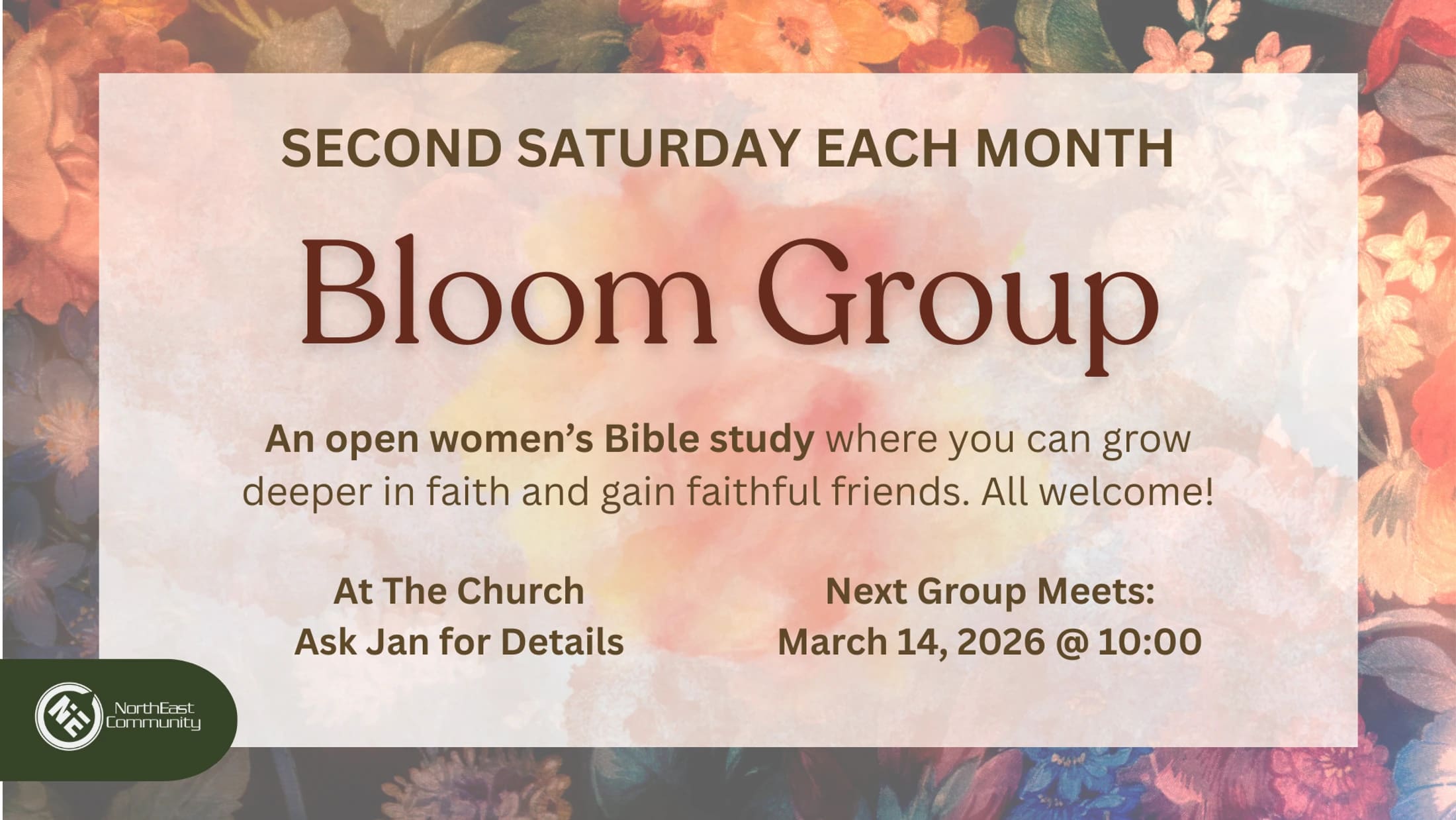At Northeast Community Church, you will find people, young and old, working together to learn how to live the way Jesus taught. We hope you find our church a place you can learn to become a faithful follower of Jesus.
